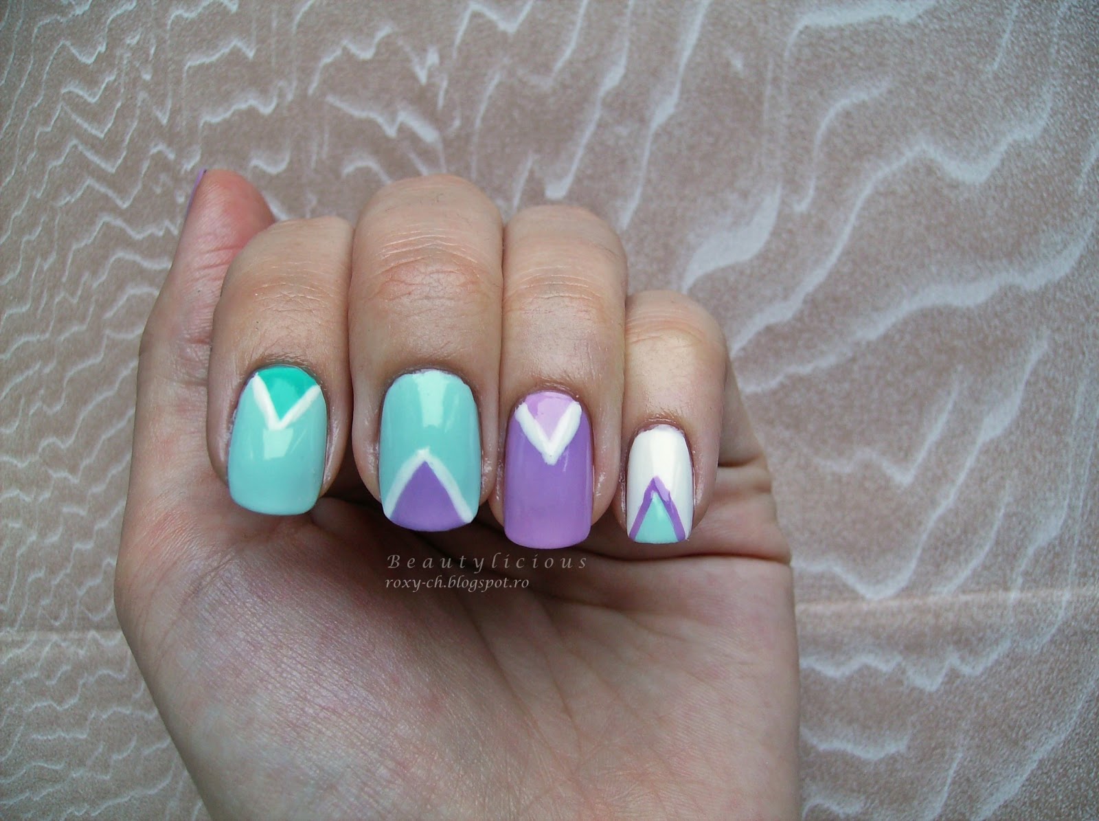 I have for you a geometric mani (first of this kind) and it's my contest entry for the Avon Challenge: Colorspin (romanian contest only) I had to recreate Alina's manicure but choose what colors I want. So I've choosed my favourite color combination for the spring/summer which is lilac and mint. Here's my approach: